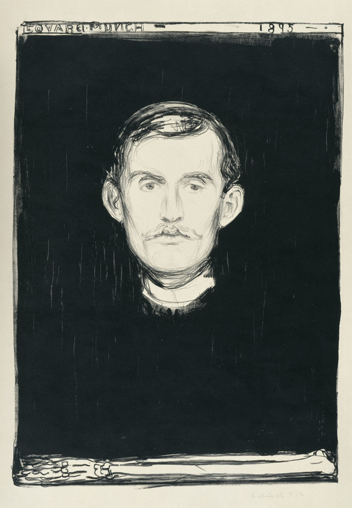 同他所欣赏的梵高一样,蒙克也是个爱拿自己当模特的画家。除了油画作品,柏林纪念特展上还有一幅蒙克的石版画自画像。蒙克的版画技能同样是在搬到柏林后新开发出来的,从1894年开始,蒙克自学蚀刻版画(etching)与石版画(lithography),很快便熟练掌握并达到精湛。
