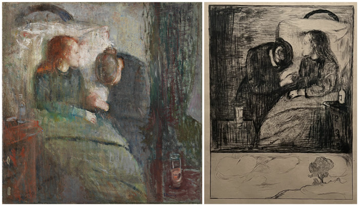 《病中的女孩》,蒙克,左图*:油画,1885/1886,奥斯陆国立美术博物馆藏品;右图:干刻技法蚀刻版画(drypoint),1894,柏林国家博物馆之版画素描博物馆藏品