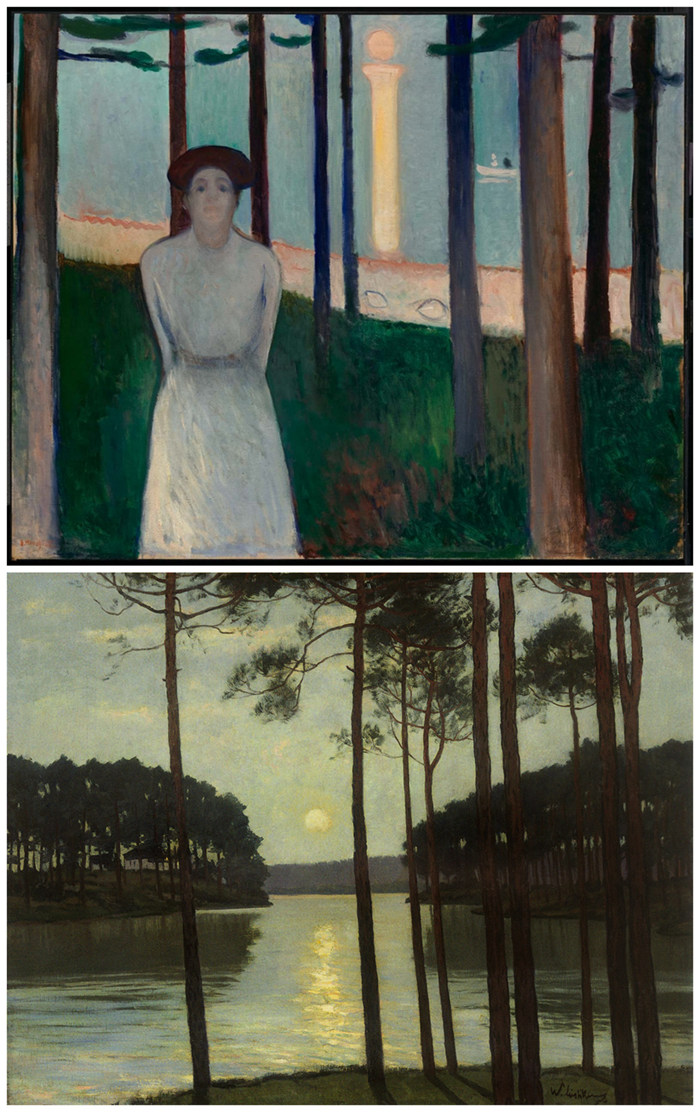 上图*:《声音(夏夜之梦)》,蒙克,1893,波士顿美术馆藏品;下图:《施拉赫滕湖之夜》,瓦尔特·莱斯蒂科(1865-1908),约1895,柏林城市博物馆基金会藏品
