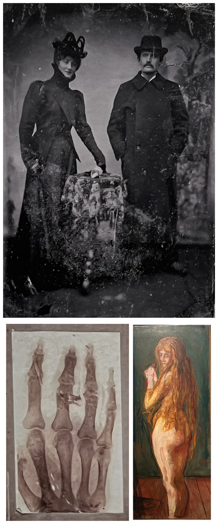 上图:蒙克与“塔拉”(Mathilde Larsen,1869-1942),约1899年,翻拍自柏林纪念特展现场;左下:蒙克左手中弹后的X光片,1902年,翻拍自柏林纪念特展现场;右下:《红发裸女》(Nude with Long Red Hair),蒙克,油画,1902,挪威蒙克美术馆藏品