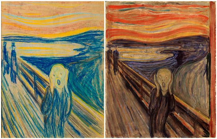 《呐喊》,蒙克,奥斯陆蒙克美术馆藏品,左图*:1893年粉彩版,粉蜡笔草稿;右图*:1893年蛋彩版(最著名版本)