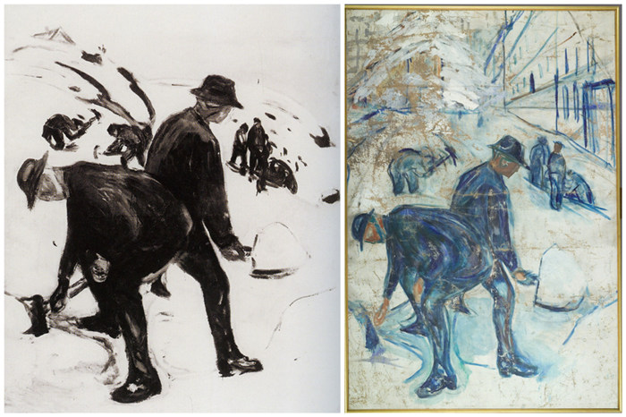 蒙克,左图*:《铲雪者》,1913-1914,曾为德国国家美术馆藏品,已被毁;右图:《建筑旁的铲雪者》,1931-1933,挪威蒙克美术馆藏品