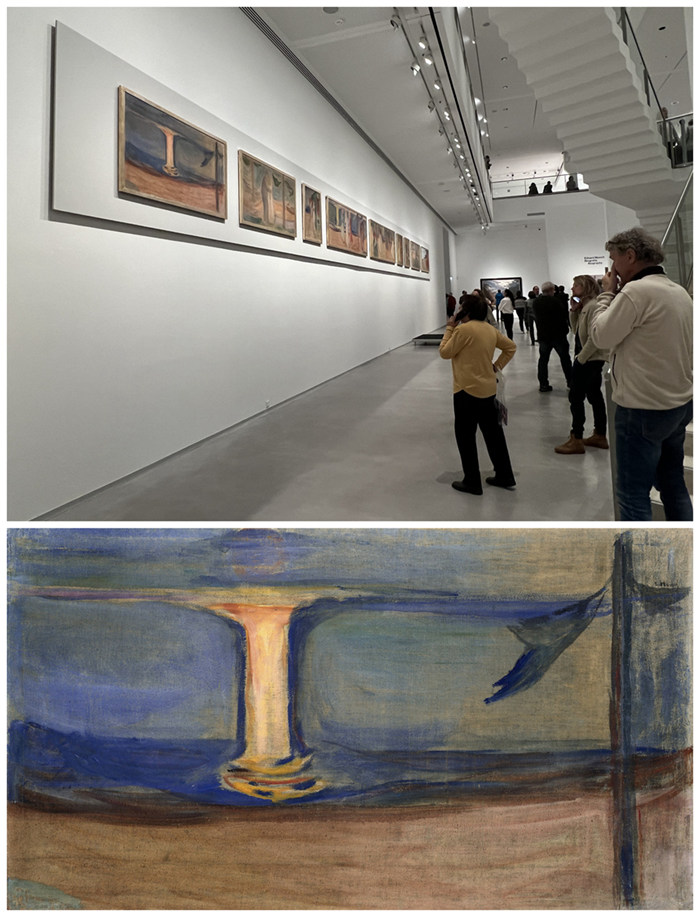 上图:2024年“爱德华·蒙克:北境魔魅”柏林纪念特展现场的“莱因哈特饰带”;下图:“莱因哈特饰带”之《海上月光》(,蒙克,1906-1907,蛋彩画,柏林国家博物馆之老国家画廊藏品