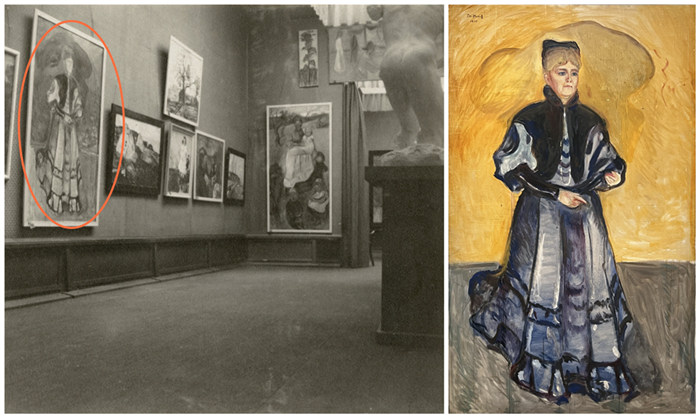左图:1907年,《伊莉莎白·弗尔斯特尔·尼采肖像》在保罗·卡西尔画廊的蒙克展览上展出。右图:《伊莉莎白·弗尔斯特尔·尼采肖像》,蒙克,1906,蒙克美术馆藏品