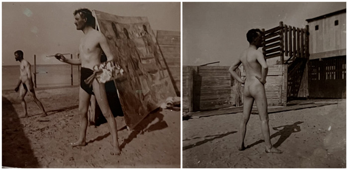 1907年,蒙克于德国海滩创作时留下的两张自拍像(翻拍于纪念特展现场)