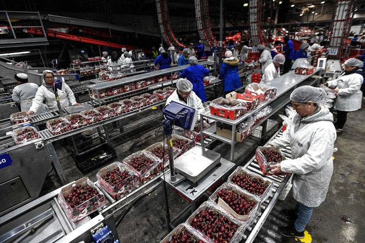 在智利莫斯塔萨尔的一座吉制公司工厂,工作人员处理车厘子(2024年12月13日摄)。新华社发(豪尔赫·比列加斯摄)
