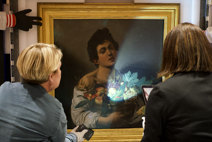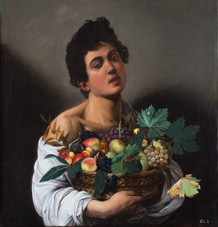 卡拉瓦乔最为人所熟知的作品,无疑也是这场展览中的焦点,即是《捧果篮的男孩》这幅画作。在相关的电影中也多次出现模特摆造型,艺术家绘画场景。这幅作品无疑是具有颠覆性的,在展厅中尺幅并不算大,人很多的时候还要挤到前方才能看到。画中一个露出肩膀的甚至有些衣衫褴褛的男孩抱着一篮水果,他皮肤并不算特别透白,但是具有雕塑般的光泽感与立体感,人物呈现一个特别放松的状态。水果篮很丰盛,具有生机,仿佛是男孩的生命力的象征。