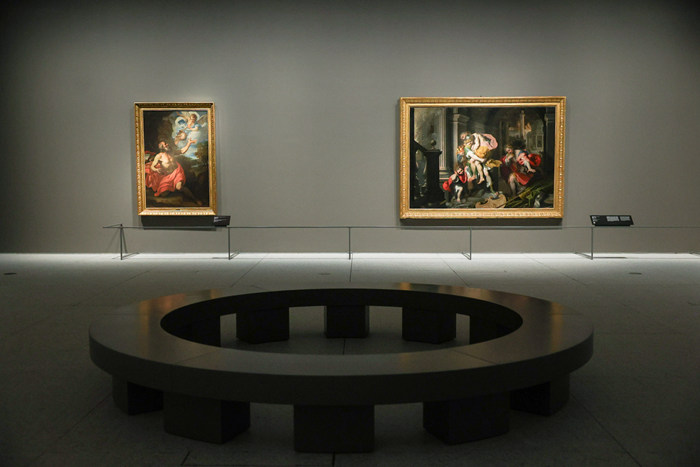 整个展览空间的展陈配合巴洛克风格带来了特别的设计。首先在光线上向卡拉瓦乔致敬——作为使用光线明暗塑造画面戏剧感的大师,卡拉瓦乔大量运用深色来创造阴影区域,再通过明亮的颜色以凸显画布上的焦点。他就像一位导演,用聚光灯将观众的目光引导到画中故事的情节高潮处,人物在昏暗的舞台布景中脱颖而出。凭借这片光影,画中人物的丰富情绪让画外的观者感同身受。随着参观者在展览中的不断深入,灯光亮度会逐渐降低,直到最后一个展示卡拉瓦乔作品的展厅。受这些作品最初在烛光下观赏的启发,该展厅的灯光亮度会非常低,从而增强其戏剧性,为站在卡拉瓦乔的画作前的观众带来一种身临其境的感觉。