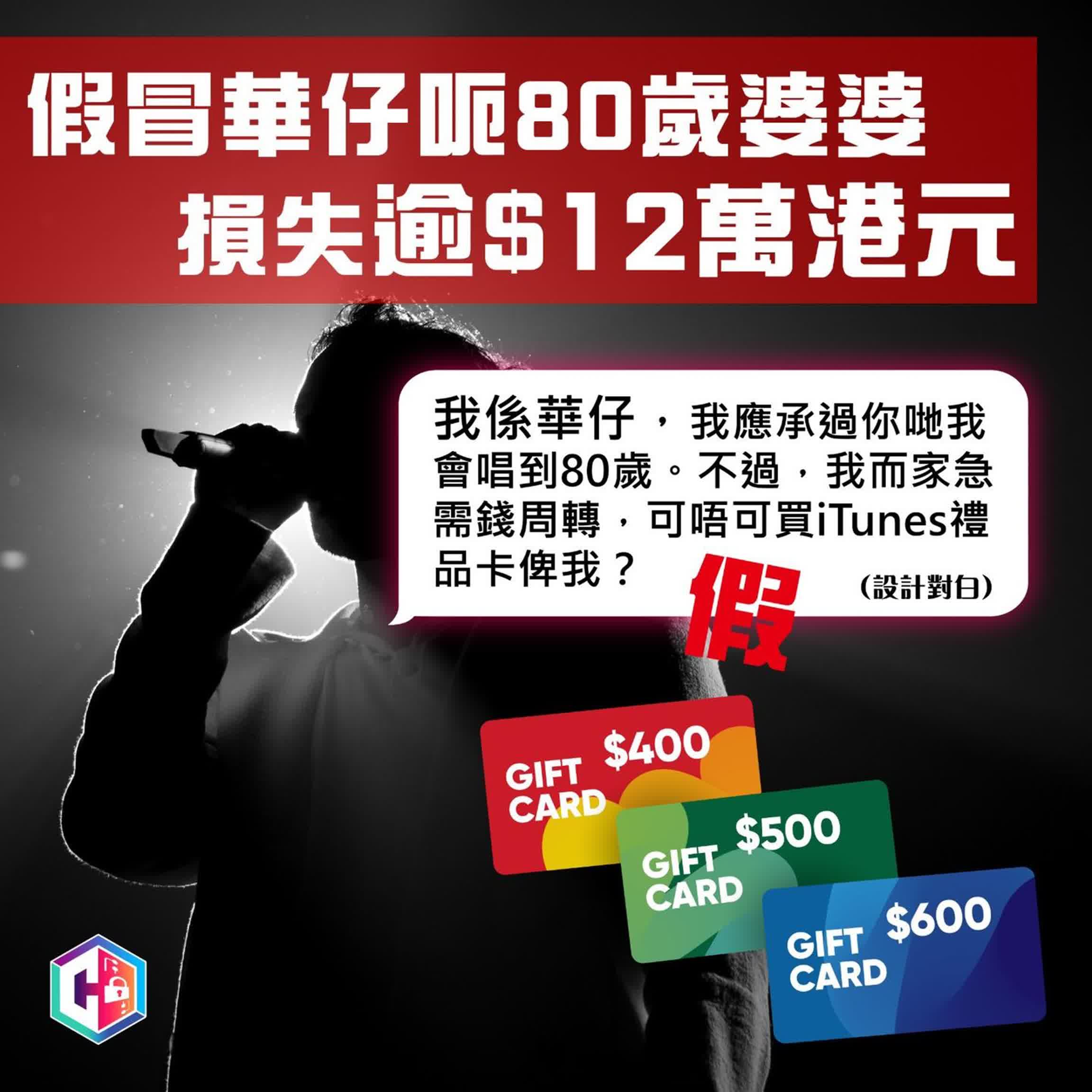 香港文匯報訊(記者 蕭景源)一名80歲婆婆,早前收到假冒藝人劉德華的WhatsApp訊息,聲稱自己現居加拿大。其後假「華仔」訛稱急需周轉,氹婆婆買iTunes禮品卡。由於婆婆是「華仔」的資深粉絲,不虞有詐,在過去5個月內,共買了44張iTunes禮品卡,並告知對方禮品卡兌換碼,結果損失逾12萬港元。