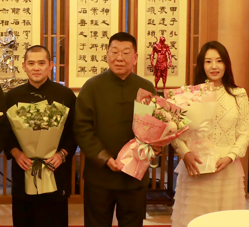 (嘉宾在开幕式现场,从左至右为:艺术家任哲、全国政协外事委员会原副主任、察哈尔学会会长韩方明、中视智信传媒有限公司总裁李智慧)