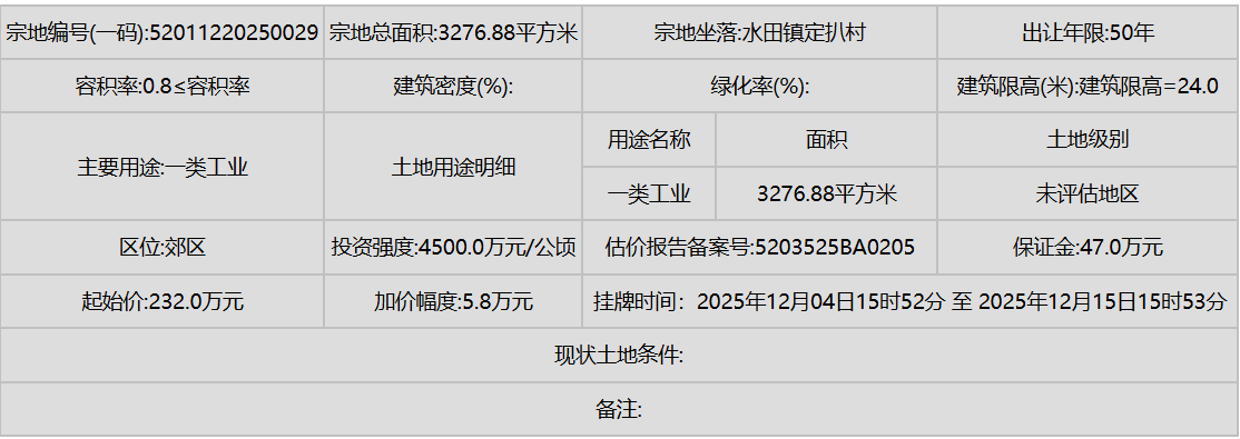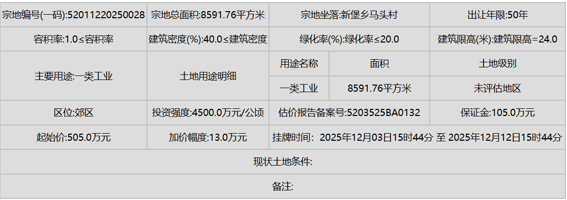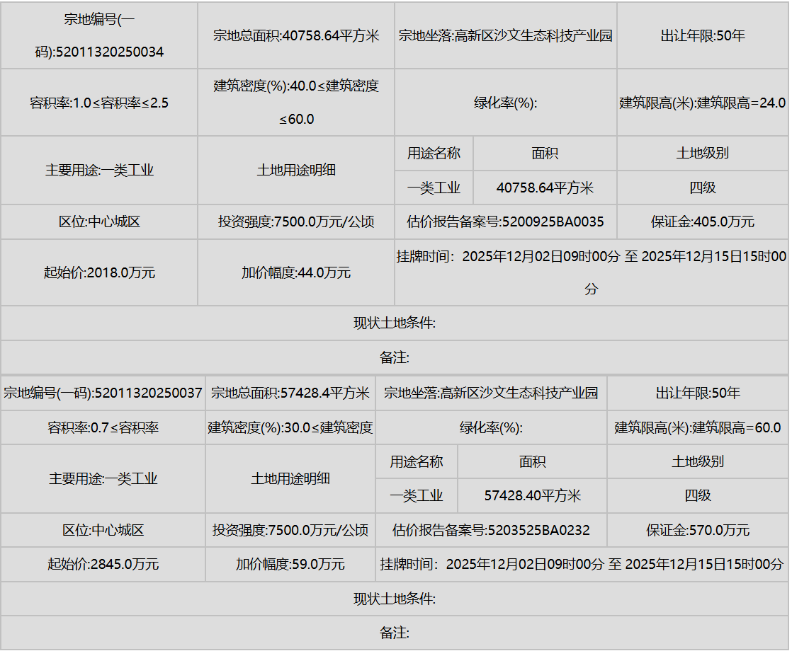 工业用地:共7宗,均为一类工业用地,聚焦于高新区沙文生态科技产业园及小孟街道等地,体现了贵阳对发展清洁、高效新型工业的重视。