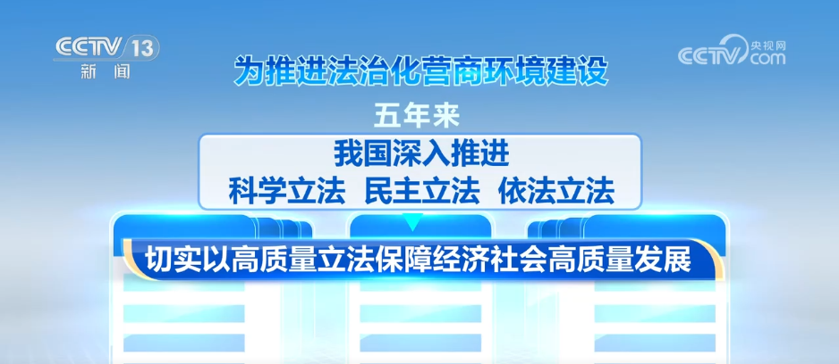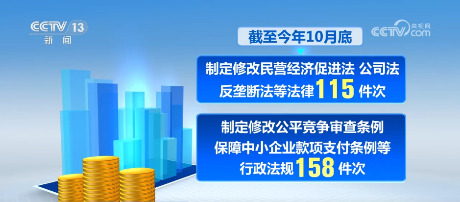 为推进法治化营商环境建设,五年来,我国深入推进科学立法、民主立法、依法立法,切实以高质量立法保障经济社会高质量发展,截至今年10月底,制定修改民营经济促进法、公司法、反垄断法等法律115件次,制定修改公平竞争审查条例、保障中小企业款项支付条例等行政法规158件次。同时,坚持立改废释并举,对全部现行600多部行政法规开展集中清理,统筹开展涉企不平等政策和法律法规清理,为建设统一大市场、推动高质量发展提供了重要保障和支撑。