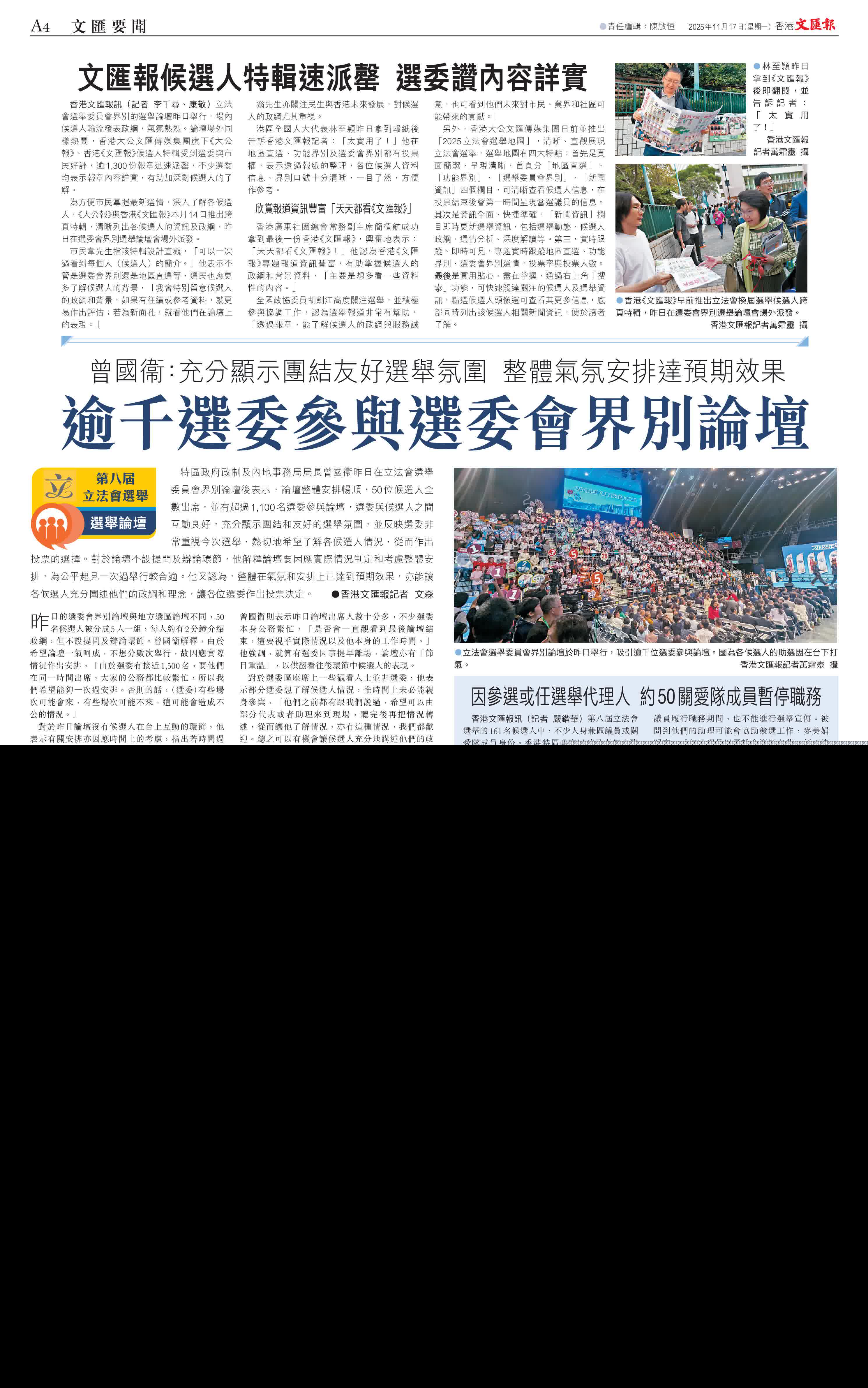 (香港文匯報記者 文森)特區政府政制及內地事務局局長曾國衞昨日在立法會選舉委員會界別論壇後表示,論壇整體安排暢順,50位候選人全數出席,並有超過1,100名選委參與論壇,選委與候選人之間互動良好,充分顯示團結和友好的選舉氛圍,並反映選委非常重視今次選舉,熱切地希望了解各候選人情況,從而作出投票的選擇。對於論壇不設提問及辯論環節,他解釋論壇要因應實際情況制定和考慮整體安排,為公平起見一次過舉行較合適。他又認為,整體在氣氛和安排上已達到預期效果,亦能讓各候選人充分闡述他們的政綱和理念,讓各位選委作出投票決定。
