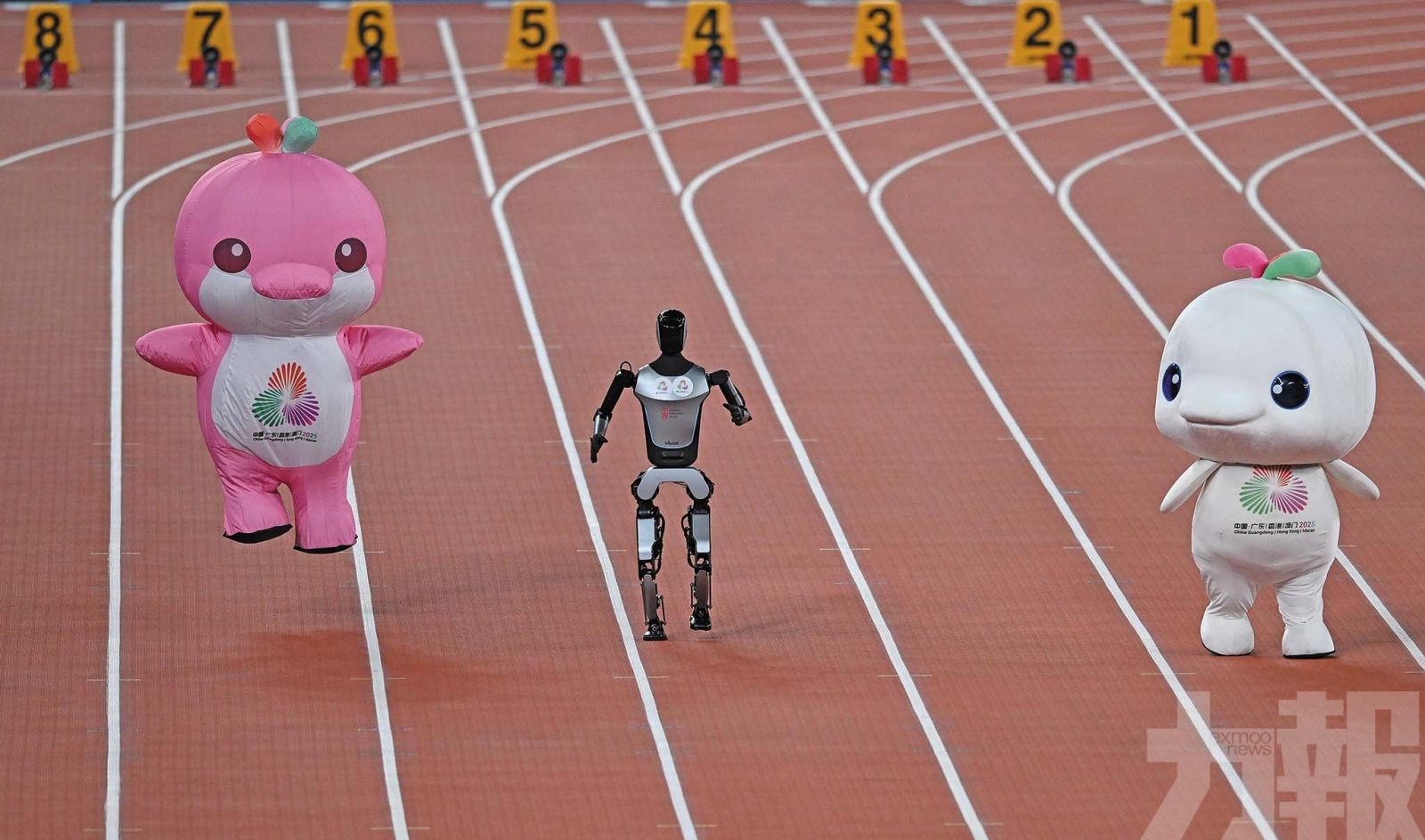 暖場活動中,機器人和吉祥物樂融融在賽跑。(新華社圖片)