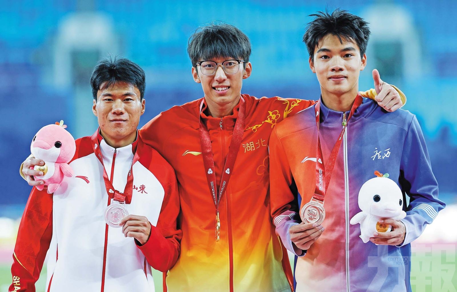 十五運會田徑男子100米決賽前三名合影。(新華社圖片)