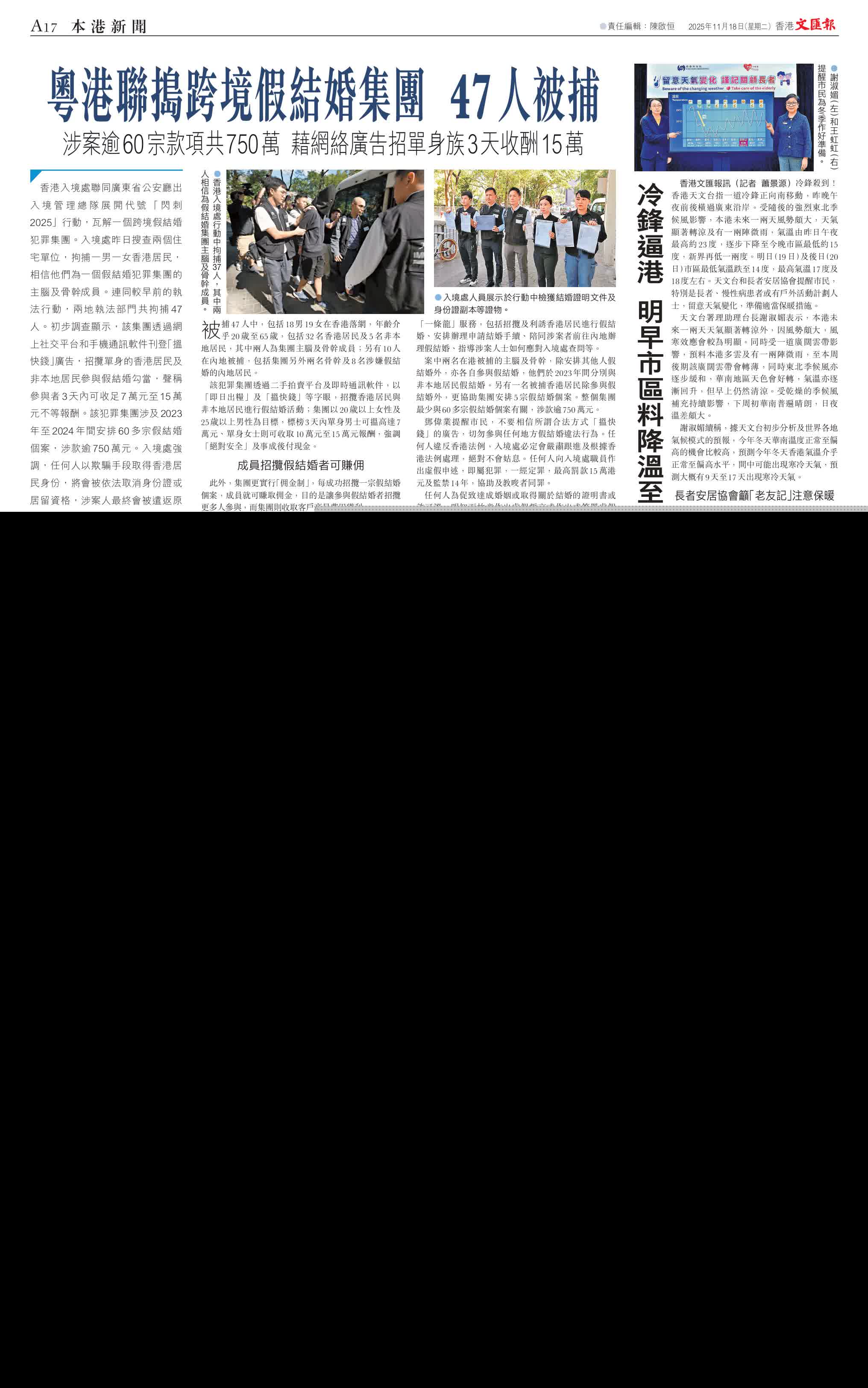 香港文匯報訊(記者 蕭景源)香港入境處聯同廣東省公安廳出入境管理總隊展開代號「閃刺2025」行動,瓦解一個跨境假結婚犯罪集團。入境處昨日搜查兩個住宅單位,拘捕一男一女香港居民,相信他們為一個假結婚犯罪集團的主腦及骨幹成員。連同較早前的執法行動,兩地執法部門共拘捕47人。初步調查顯示,該集團透過網上社交平台和手機通訊軟件刊登「搵快錢」廣告,招攬單身的香港居民及非本地居民參與假結婚勾當,聲稱參與者3天內可收足7萬元至15萬元不等報酬。該犯罪集團涉及2023年至2024年間安排60多宗假結婚個案,涉款逾750萬元。入境處強調,任何人以欺騙手段取得香港居民身份,將會被依法取消身份證或居留資格,涉案人最終會被遣返原居地。