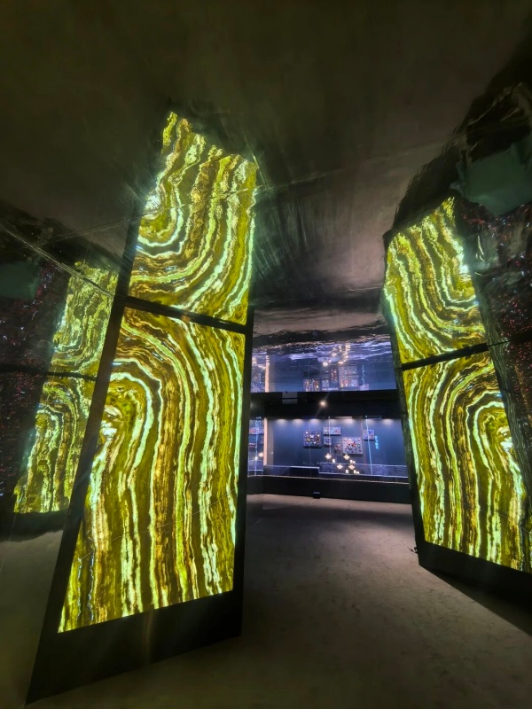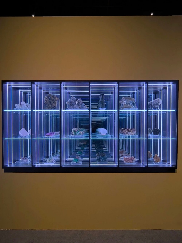 第四单元“岩矿撷萃”为观众奉上了一场视觉与互动的盛宴。“遇见古海精灵”展出来自摩洛哥、距今约4.2亿年的直角石化石,仿佛在邀请观众与史前海洋生灵展开一场跨越时空的奇妙对话;“光影迷宫”则通过精心设计的光影装置,营造沉浸式的观展体验。