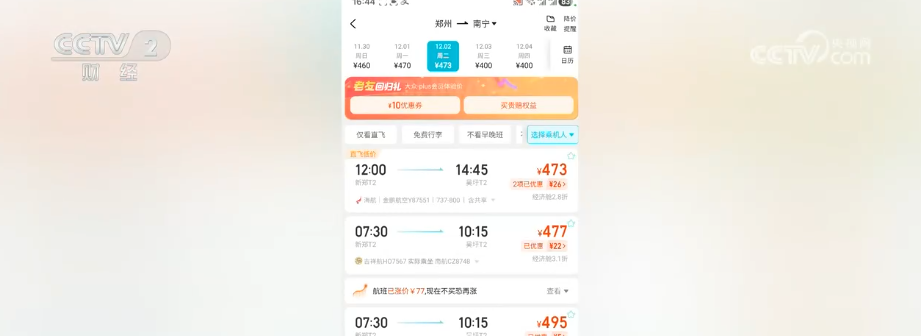 王宇鹏发现最近飞往南方的航班价格很实惠。比如,12月份,北京飞西双版纳的票价大多在600元以内。此外,郑州飞南宁、西安飞三亚的航班票价也较低。