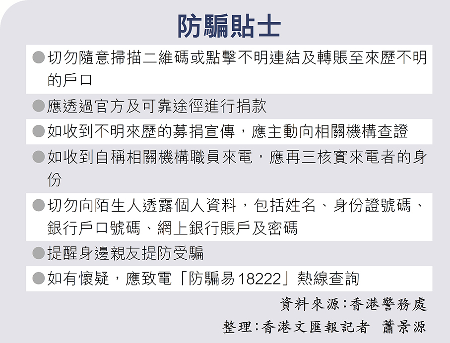 香港文匯報訊(記者 蕭景源)上周三(11月26日)大埔宏福苑發生五級大火,至今釀成146人死亡,多人受傷及失聯,面對大批災民喪失至親,家園盡毀,竟有騙徒趁此災難時刻混水摸魚謀發災難財。有在事件中痛失家園的宏福苑居民連日來收到多通可疑電話,對方自稱是義工,以協助申請援助金為由,企圖騙取其個人資料;亦有騙徒利用慈善機構名義發出籌款的釣魚短訊,行為如同在災民傷口撒鹽,令人髮指。