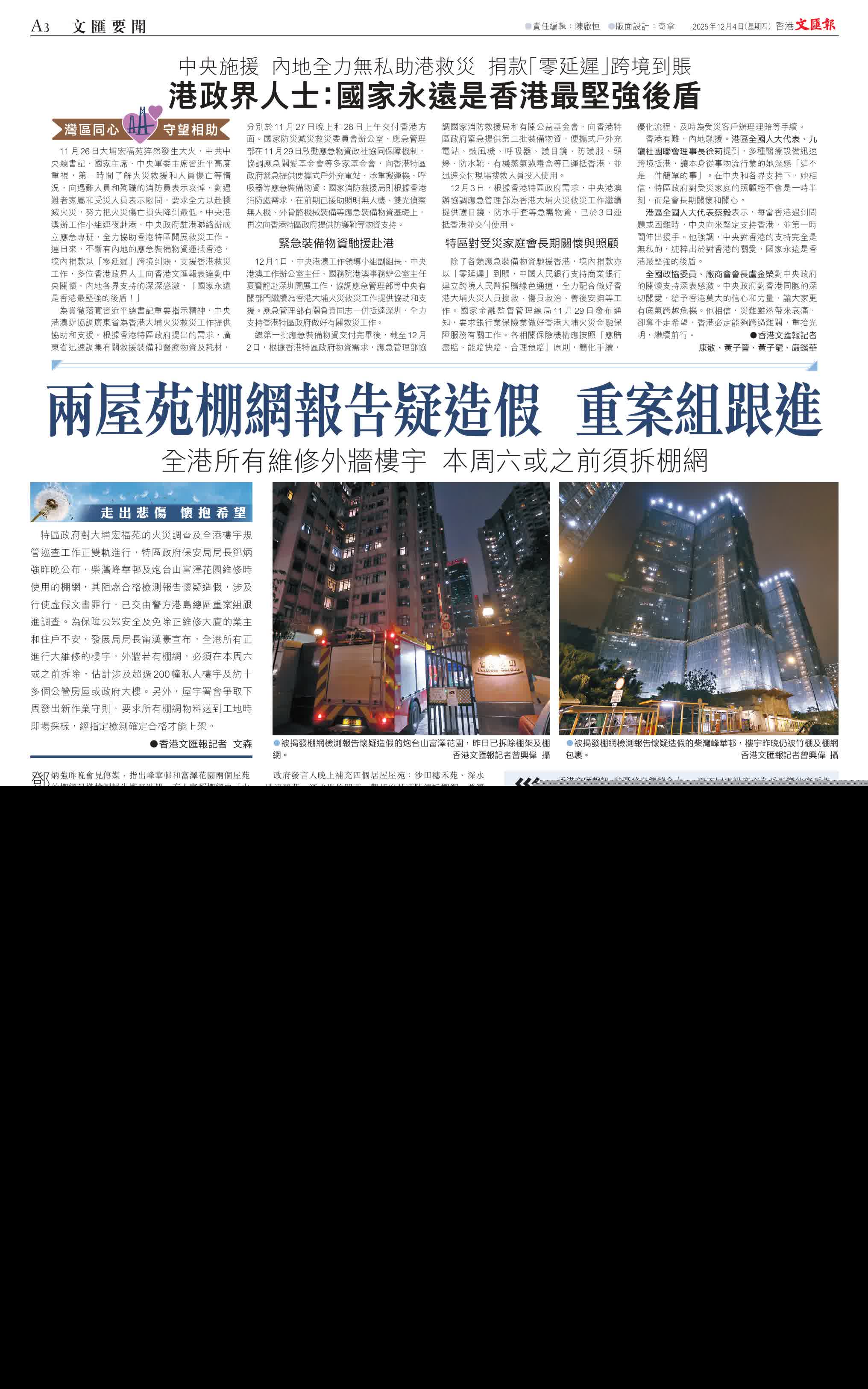 香港文匯報訊(記者 文森)特區政府對大埔宏福苑的火災調查及全港樓宇規管巡查工作正雙軌進行,特區政府保安局局長鄧炳強昨晚公布,柴灣峰華邨及炮台山富澤花園維修時使用的棚網,其阻燃合格檢測報告懷疑造假,涉及行使虛假文書罪行,已交由警方港島總區重案組跟進調查。為保障公眾安全及免除正維修大廈的業主和住戶不安,發展局局長甯漢豪宣布,全港所有正進行大維修的樓宇,外牆若有棚網,必須在本周六或之前拆除,估計涉及超過200幢私人樓宇及約十多個公營房屋或政府大樓。另外,屋宇署會爭取下周發出新作業守則,要求所有棚網物料送到工地時即場採樣,經指定檢測確定合格才能上架。