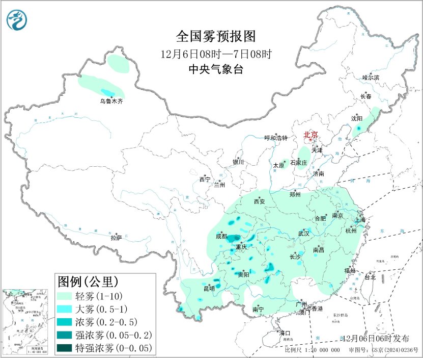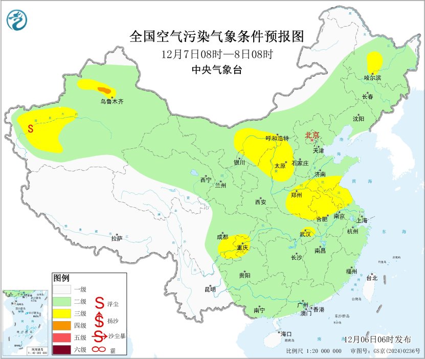 此外,6日至7日,内蒙古中西部等地的部分地区有扬沙或浮尘天气。6日早晨至上午,四川盆地中东部、贵州中西部、湖南西部有大雾天气,局地能见度不足200米。