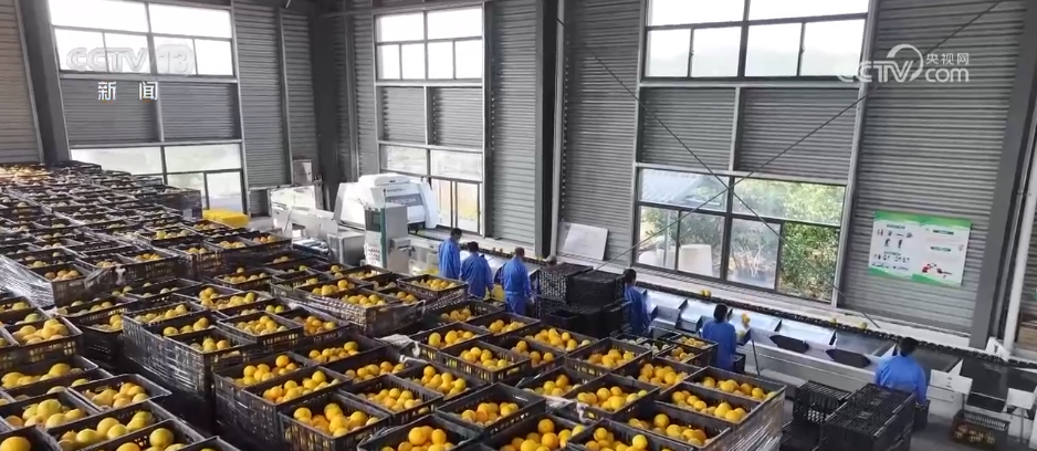 除轨道车外,无人机可应对复杂地形及小批量急送需求。胡柚下山后经智能分选中心,精准检测表皮、色泽、重量等数据并自动分选,每小时可处理数吨。筛选出来的优质鲜果会直接上市出售,其他则会被送去深加工线,制成果汁、果胶等。工厂也会跟柚农签订保底收购协议,让大家不为销路发愁。合作社负责人称,通过线上线下全面销售,特别是线上直播间,每天的胡柚销售量大概有2000多箱,还有深加工的果汁销售也非常火爆。