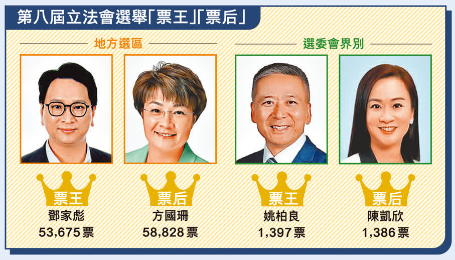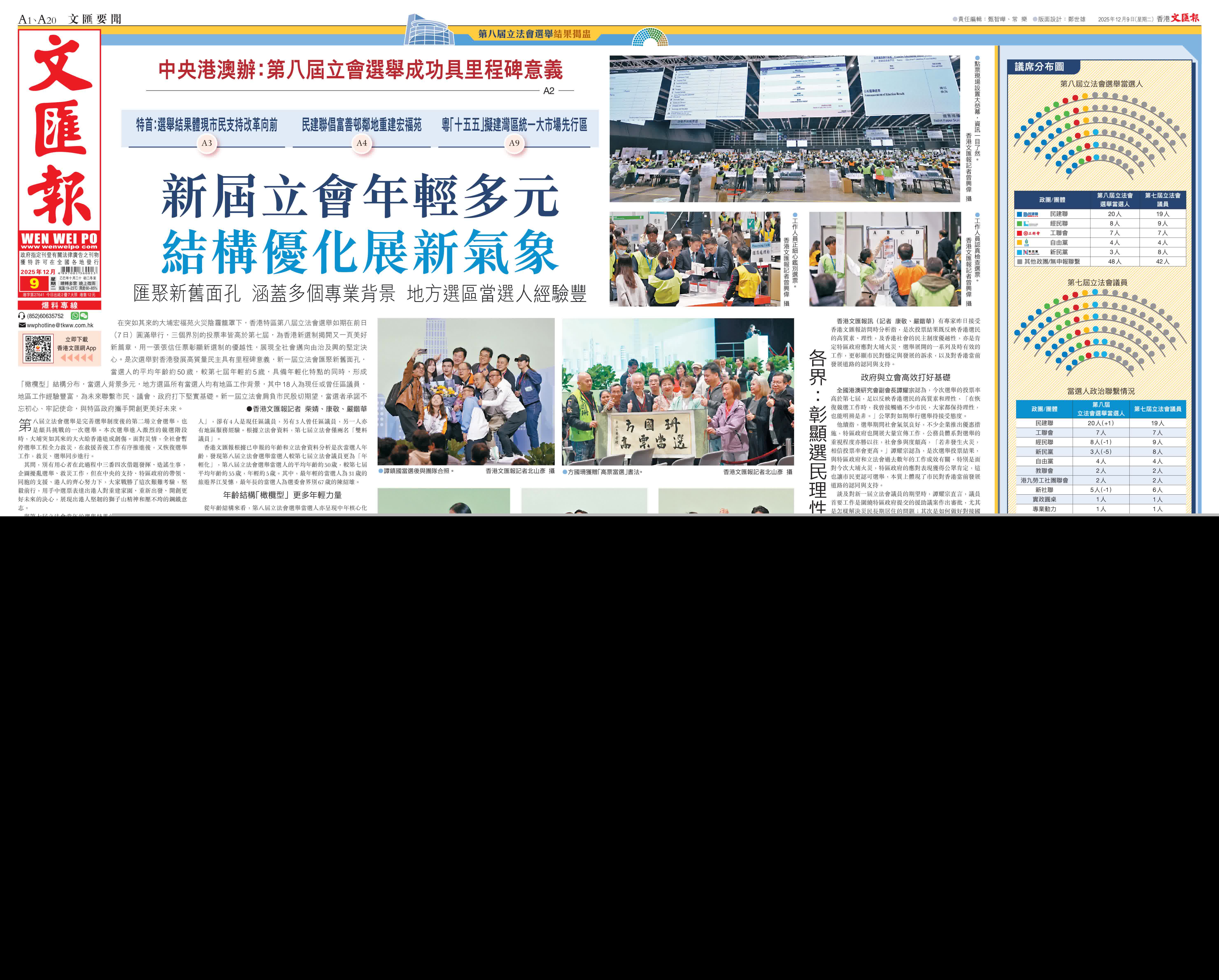 (香港文匯報記者 柴婧、康敬、嚴鍇華)在突如其來的大埔宏福苑火災陰霾籠罩下,香港特區第八屆立法會選舉如期在前日(7日)圓滿舉行,三個界別的投票率皆高於第七屆,為香港新選制揭開又一頁美好新篇章,用一張張信任票彰顯新選制的優越性,展現全社會邁向由治及興的堅定決心。是次選舉對香港發展高質量民主具有里程碑意義,新一屆立法會匯聚新舊面孔,當選人的平均年齡約50歲,較第七屆年輕約5歲,具備年輕化特點的同時,形成「橄欖型」結構分布,當選人背景多元,地方選區所有當選人均有地區工作背景,其中18人為現任或曾任區議員,地區工作經驗豐富,為未來聯繫市民、議會、政府打下堅實基礎。新一屆立法會肩負市民殷切期望,當選者承諾不忘初心、牢記使命,與特區政府攜手開創更美好未來。