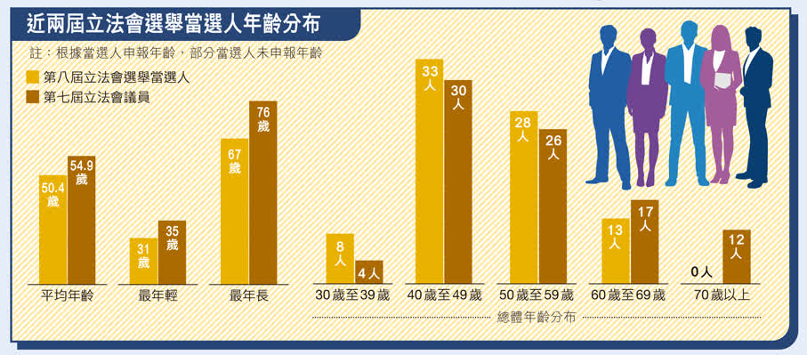 60歲以上議員比例顯著下降,第七屆立法會該年齡層佔約33%,已申報年齡的第八屆立法會選舉當選人中,該年齡層的比例僅佔約16%;70歲以上議員第七屆立法會有12位,第八屆立法會選舉當選人中則沒有人年過七十。