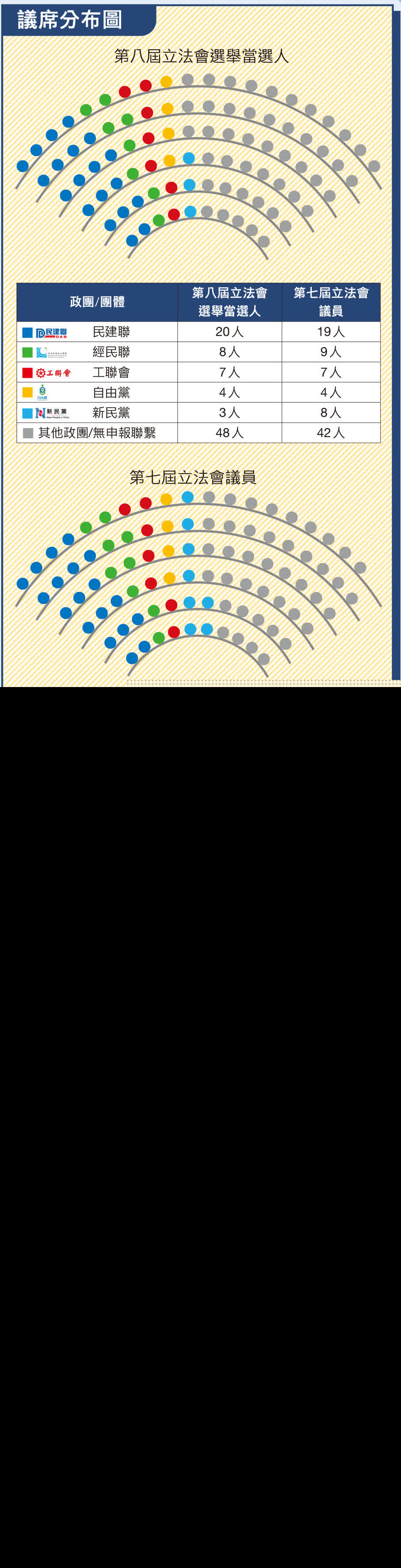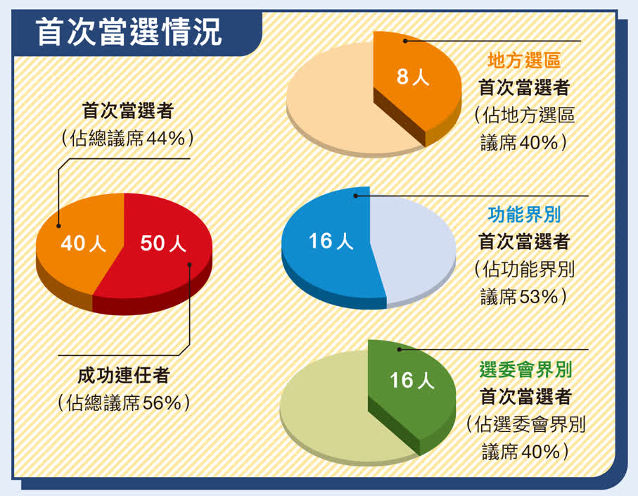 健康的政治生態要不斷湧入「活水」,資深議員打好基礎、新面孔加入新思維,新一屆立法會正展現這樣的格局。是次當選人中,首次當選者有40人,佔總議席的44%,其中地方選區首次當選者有8人,佔該界別議席的40%;功能界別首次當選者有16人,佔該界別議席53%;選委會界別首次當選者有16人,佔該界別議席的40%。