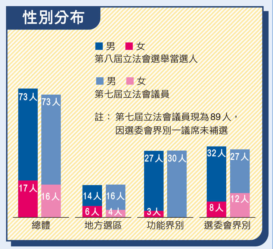 從年齡結構來看,第八屆立法會選舉當選人亦呈現中年核心化的特點。當選人中40歲至59歲佔61人,佔已申報年齡當選人的約74%,而第七屆立法會議員中有56位是40歲至59歲,佔比約63%;30歲至39歲的年齡層,第七屆議員中有4人,已申報年齡的第八屆立法會選舉當選人則翻一倍至8人,證明新一屆立法會將加入更多年輕力量。