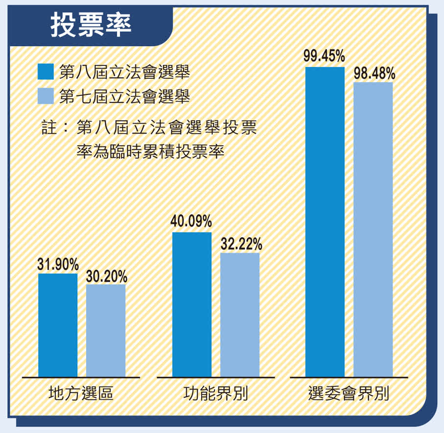 與第七屆立法會當年的選舉結果相比,三個界別的投票率均有所增長,其中是次地方選區的投票率為31.9%,較第七屆30.2%上升1.7個百分點;功能界別投票率為40.09%,較第七屆32.22%上升7.87個百分點,選委會界別投票率較第七屆98.48%更高,達99.45%。