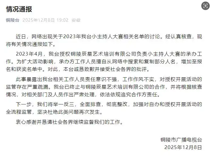 ·铜陵广播电视台回应“获奖名单照搬人名大全”: 承办方擅自搜索复制部分人名。
