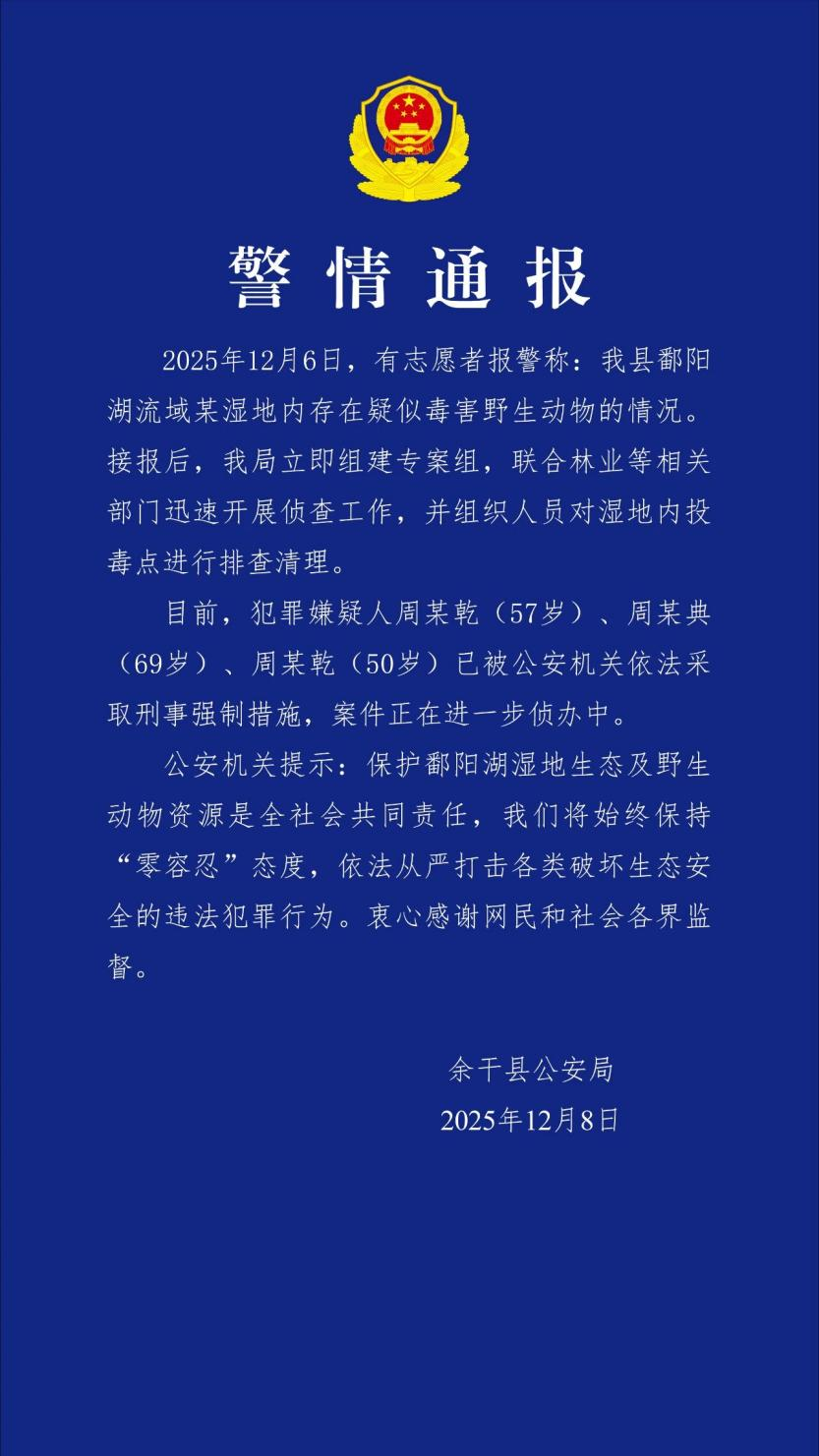 ·3人疑在鄱阳湖毒害候鸟,警方通报。