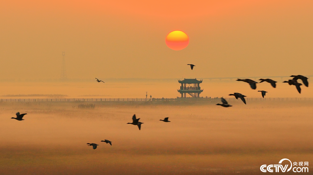 江西九江:晨雾轻拢鄱阳湖,再现“秋水共长天一色”诗意。