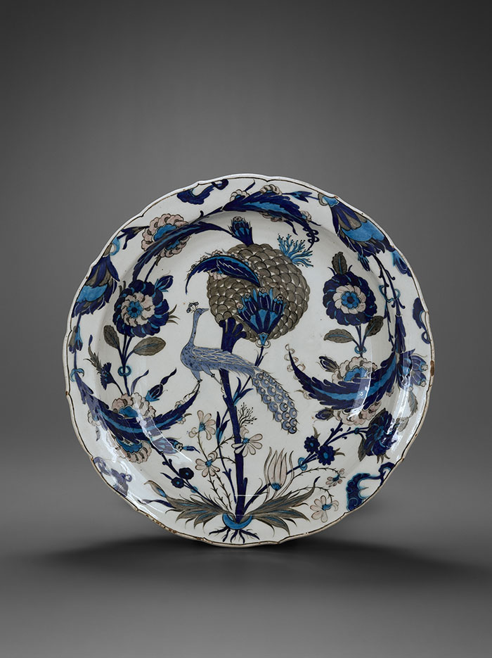 本次展览的另一个亮点是为数不少的青花瓷器,尤以来自波斯和奥斯曼为精。虽然这场展览没有涉及中国古代文明,但是这些青花瓷器却体现了早期丝绸之路的影响以及16世纪以后中国的贸易影响力。最早,波斯陶是以孔雀蓝、孔雀绿等釉色为特征的古代西亚釉陶器,在9-10世纪通过海上丝绸之路传入中国,在福州、广州等港口遗址中均有出土。后来到了元代和明初有大量青花瓷通过贸易(如外销瓷)流入中东,波斯萨法维王朝的统治者对其极度痴迷,于是他们开启了一场雄心勃勃的“本土创新”运动。在王室赞助下,波斯工匠努力模仿中国的青花瓷,他们原本擅长的是锡白釉陶,故在此材质基础上做到外观上的相似,而实际的图样确实不同,一个是以前文提及的“乐园”元素为主,另一个则是加入了一些阿拉伯诗文书法、藤蔓纹、狩猎图以及象征神秘主义的元素,所以往往颜色也并非单纯的青花,青花本身的层次有深浅,再加上一些红釉和孔雀绿的色彩。这些萨法维王朝的青花瓷,何尝不是多种文明的叠加之样态呢?
