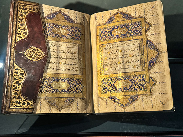 莫卧儿帝国的水晶马首镶嵌着祖母绿与红宝石、雕刻着繁复花纹的象牙柜子、细密画与神秘书法,波斯帝国引以为傲的青花瓷、繁复编织的波斯地毯、皮革制作的《古兰经》,还有奥斯曼帝国苏丹艾哈迈德一世亲签的如同一串铃兰般造型的文书…… 这些琳琅满目的珍品诠释着繁复的装饰美学,穿越历史的尘埃依旧栩栩如生地展现在今人面前。这些珍宝来自“太阳王”路易十四的珍藏,曾藏于凡尔赛宫,后转移到卢浮宫。