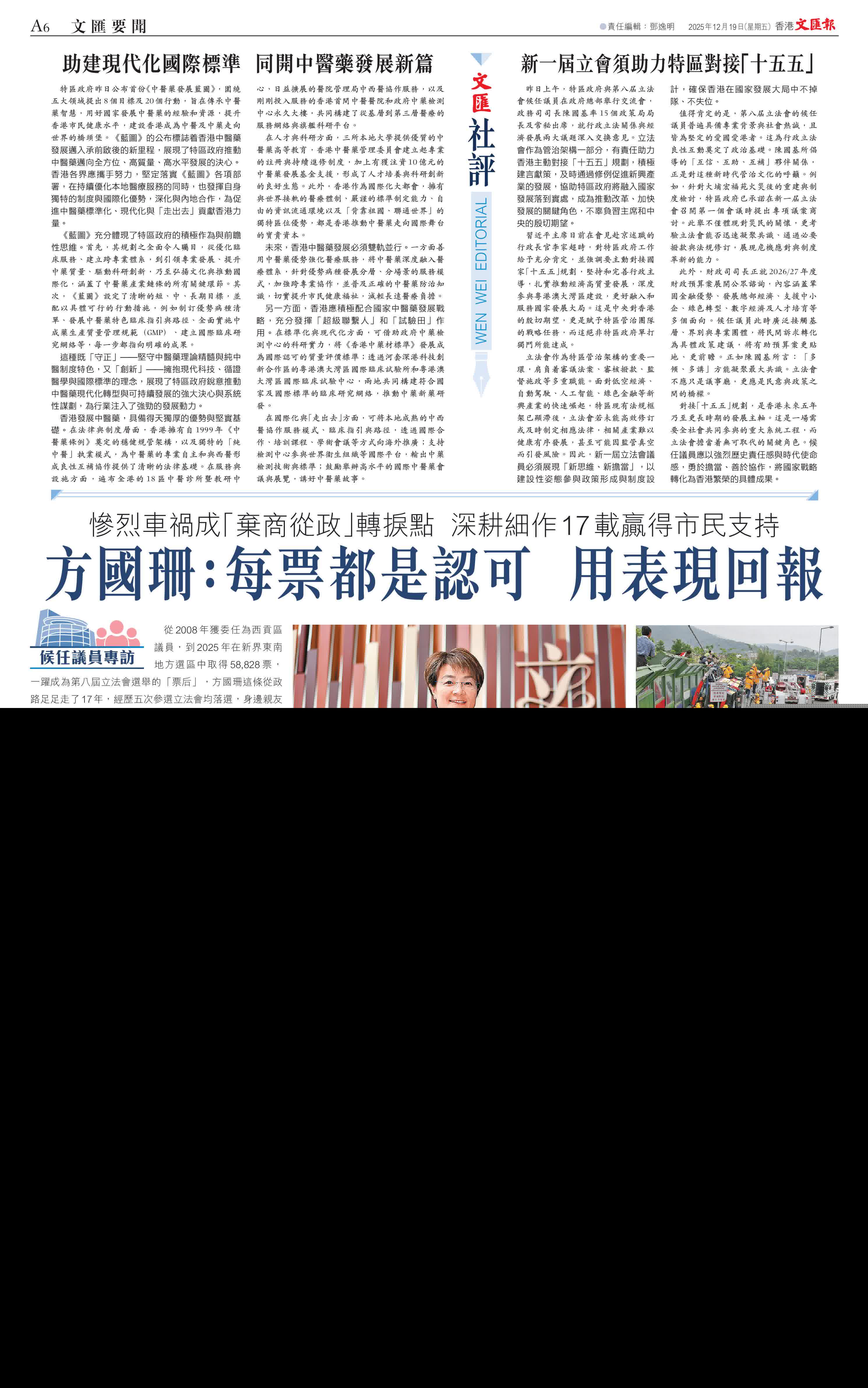 (香港文匯報記者 黃子龍)從2008年獲委任為西貢區議員,到2025年在新界東南地方選區中取得58,828票,一躍成為第八屆立法會選舉的「票后」,方國珊這條從政路足足走了17年,經歷五次參選立法會均落選,身邊親友無數次勸喻放棄,但她始終懷抱着服務社區的初心屢敗屢選,強大的信念源於2008年西貢一場慘痛的交通意外,她說:「這是一次深刻教訓 ,我當時在想,只要各部門多行幾步,應該很多事就可以避免發生。」為了推動制度改進、為小市民發聲、為悲劇作終,她堅定不移地深耕細作,最終贏得眾多新界東南居民的認可,「每一票,都是市民對我過去工作的認可,都是17年來的積累,都是我未來工作的動力,我絕不會辜負市民,會用表現回報這些選票。」