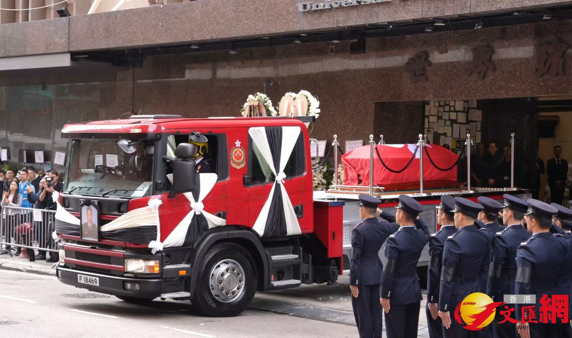 早上10時30分,喪禮官方儀式完成後,靈車離開紅磡世界殯儀館期間,政府官員及消防人員將列隊在殯儀館外,向消防隊目何偉豪作最後致敬。