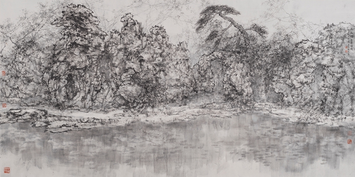 潜心“园林”,既是因过去工作繁忙无法外出写生的“短板”转化,更是对中国美学核心精神的深入探寻。王明明投入大量精力研读园林理论著作,从中感悟中国美学意境精髓与哲学观念。在其笔下,无论是皇家园林的“气象”还是文人园林的“气质”,都体现出中国哲学的“虚”“空”之境。同时,其观察视角与表现方法又贴合现代人的视觉经验,让观者感到亲切而内心精神又得到净化与升华。他的园林系列,不仅是其笔墨功力与艺术修养的集中体现,也是其追求平和、内省的君子心境的外化。