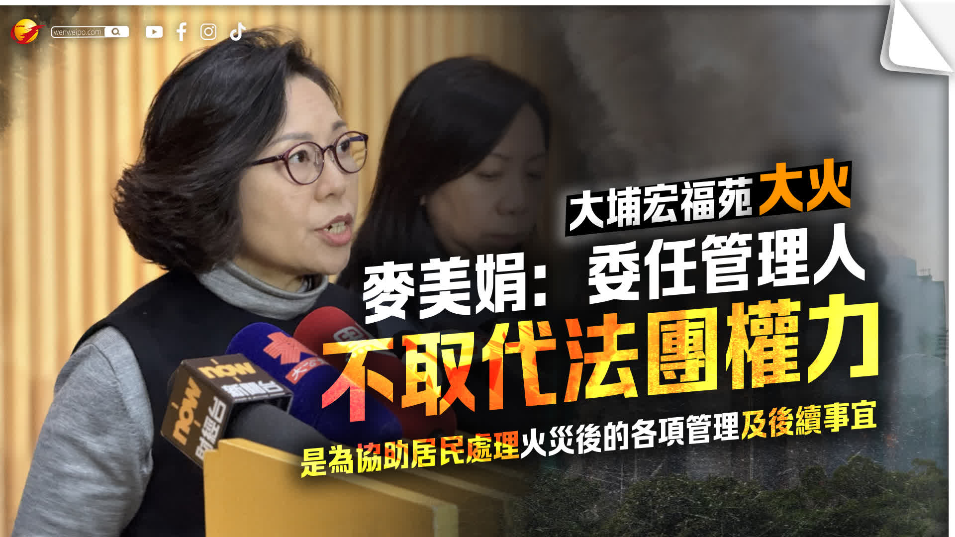 大埔宏福苑11月26日發生五級大火,造成嚴重人員傷亡,善後工作仍在進行中。政府早前引用《建築物管理條例》第31條,向土地審裁處申請解散現有業主立案法團管理委員會,委任華懋集團旗下合安管理有限公司為委任管理人。民政及青年事務局局長麥美娟今日(21日)強調,解散現有業主立案法團管理委員會,業主立案法團仍然存在,委任管理人僅取代管委會職能,不會取代法團的法定權力。
