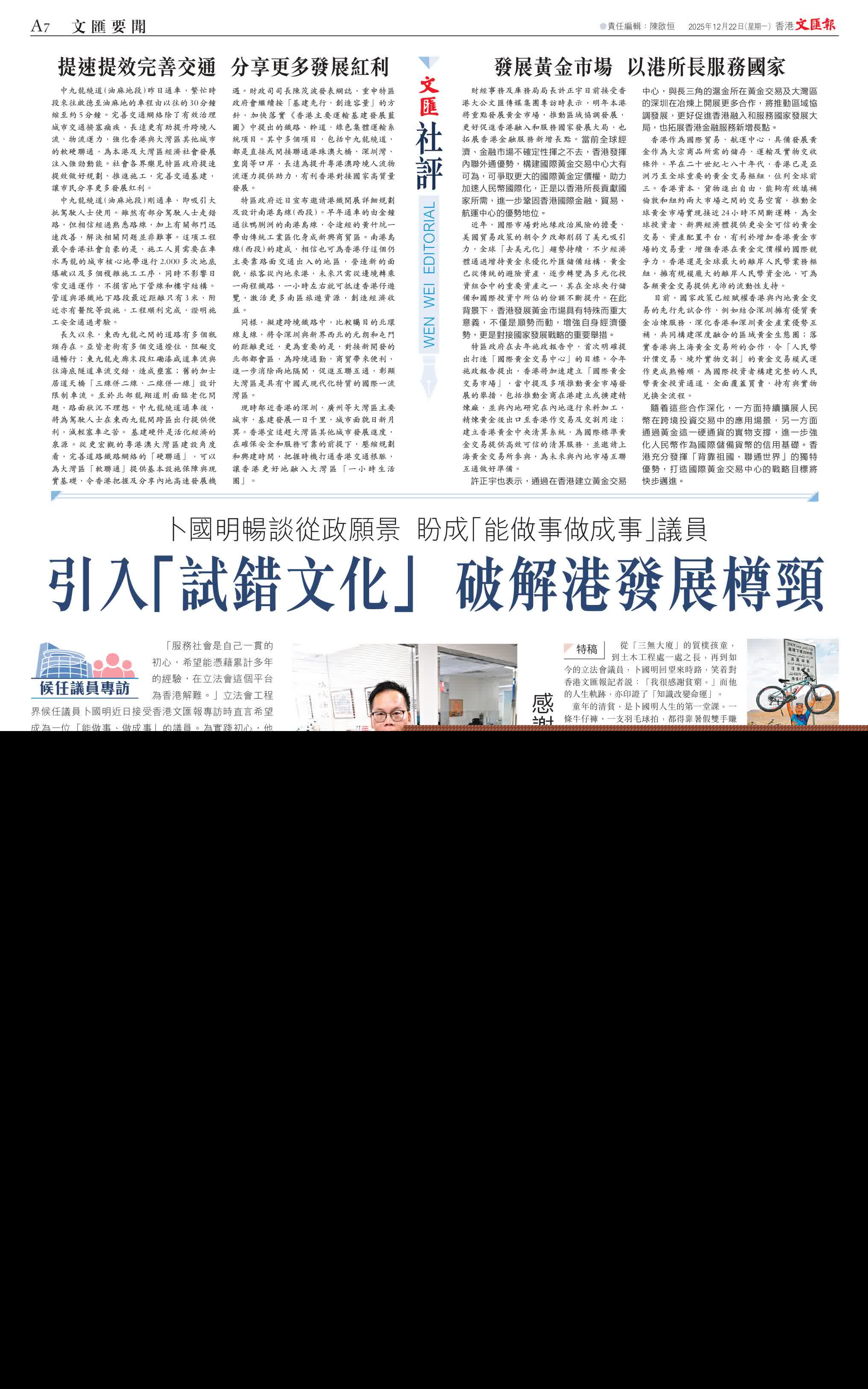 香港文匯報訊(記者 洪澤楷)「服務社會是自己一貫的初心,希望能憑藉累計多年的經驗,在立法會這個平台為香港解難。」立法會工程界候任議員卜國明近日接受香港文匯報專訪時直言希望成為一位「能做事、做成事」的議員。為實踐初心,他制定了4年藍圖,聚焦於三大核心目標:加快北部都會區發展、推動北都區以外基建以刺激經濟,以及倡導「促進者」與「試錯文化」,為香港提升整體競爭力。