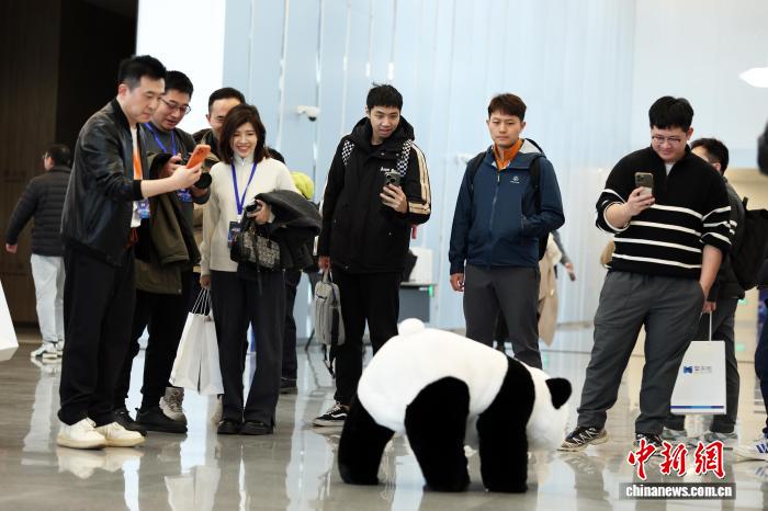 12月22日,中国首个开放式机器人租赁平台擎天租在上海发布。发布会场外,一款熊猫外观的机器人受到“围观”。中新社记者 汤彦俊 摄