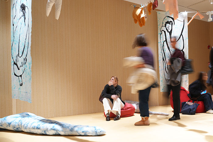 在“社会”单元中,艺术家关注日常经验中隐蔽的结构性压力与人际互动的细微情绪。如克鲁布·加洛普的《04:23》以黑白图像呈现失眠与社会压力的隐性机制;他的另一个作品《是什么让我们疲惫不堪》以蜡染技法在旧床单上印制抽象人形等方式,让“疲惫”具象化,温和地要求观众停下脚步,重新思考如何在生产和生活之间取得平衡。本单元作品以幽默与反讽勾勒现代生活的荒诞,揭示身份、都市体验与时代情绪的复杂性。