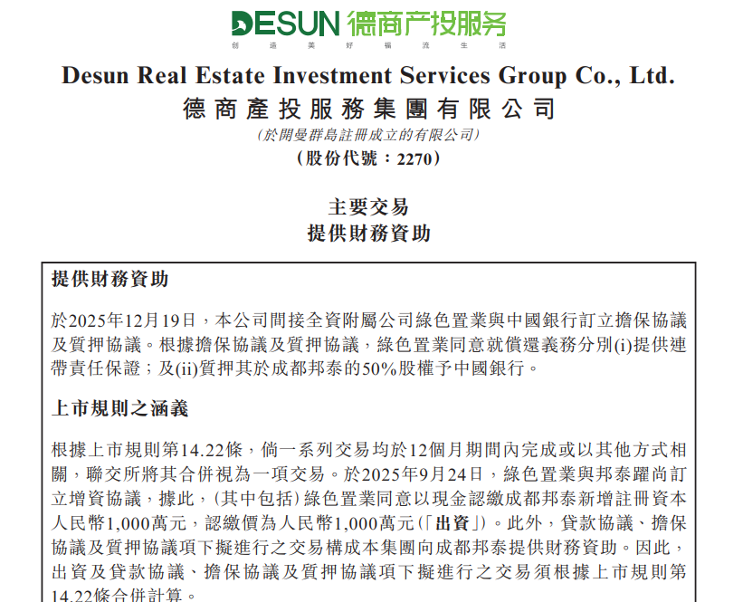 乐居财经 李兰 近日,德商产投服务(02270.HK)发布公告,其旗下四川德商智慧绿色置业有限公司(以下简称:绿色置业)拟为项目公司成都邦泰锦宸置业有限公司(简称“锦宸置业”)的一笔土地开发贷款提供财务资助。