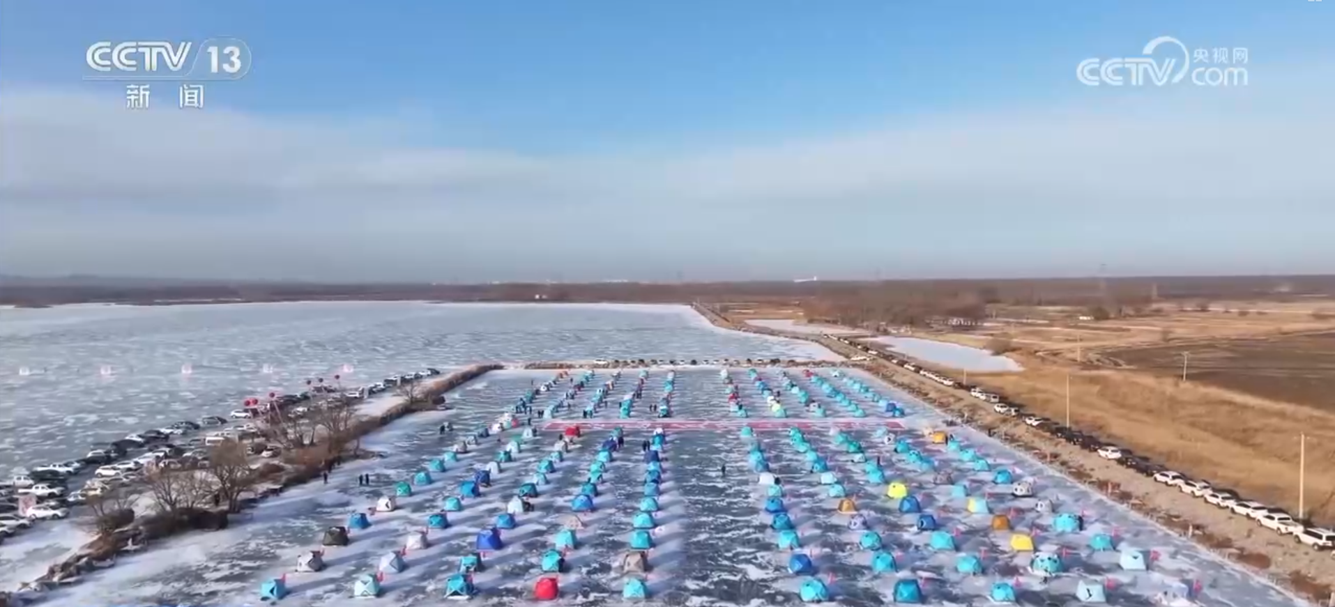 在另一处赛场,冰钓竞技同样精彩。240名冰钓爱好者齐聚于此,参加为期三天的冰钓大赛。在水库冰面上,一顶顶帐篷整齐排列,选手们在帐篷内进行操作。