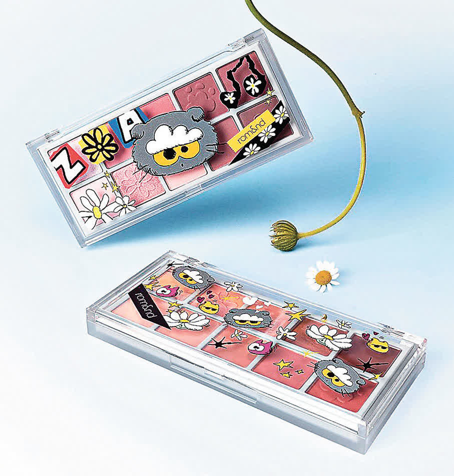 G-DRAGON的愛貓ZOA聯同一班朋友仔組成的ZO&FRIENDS夢幻組合,以可愛形象深受大家歡迎,每次推出的周邊產品甚至炒得有價有市。今次ZO&FRIENDS進軍美妝界,與人氣韓國美妝品牌rom&nd聯名推出彩妝,系列包含雙色貓爪護唇膏、氣墊粉餅、四色眼影盤、果汁腮紅球、果汁唇釉等。外殼印有ZOA和小夥伴小雛菊花、小精靈圖案,即使用來收藏也相當得意。其中,唇釉還推出兩款特別色,分別是以烏雲為靈感#20灰白色與#38暗灰色,可以疊塗其他飽和的粉嫩色,混搭出柔和效果。