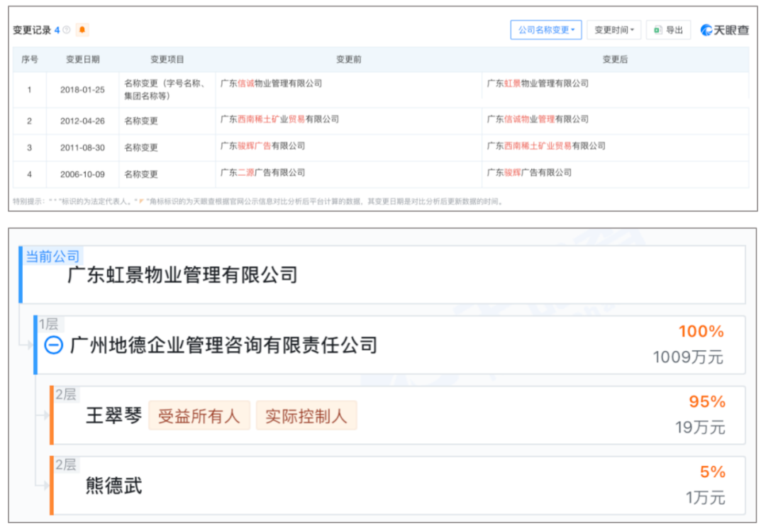 穿透股权,虹景物业目前由广州地德企业管理咨询有限公司全资控股,再往上是两位自然人股东,王翠琴、熊德武分别持股占比95%、5%。