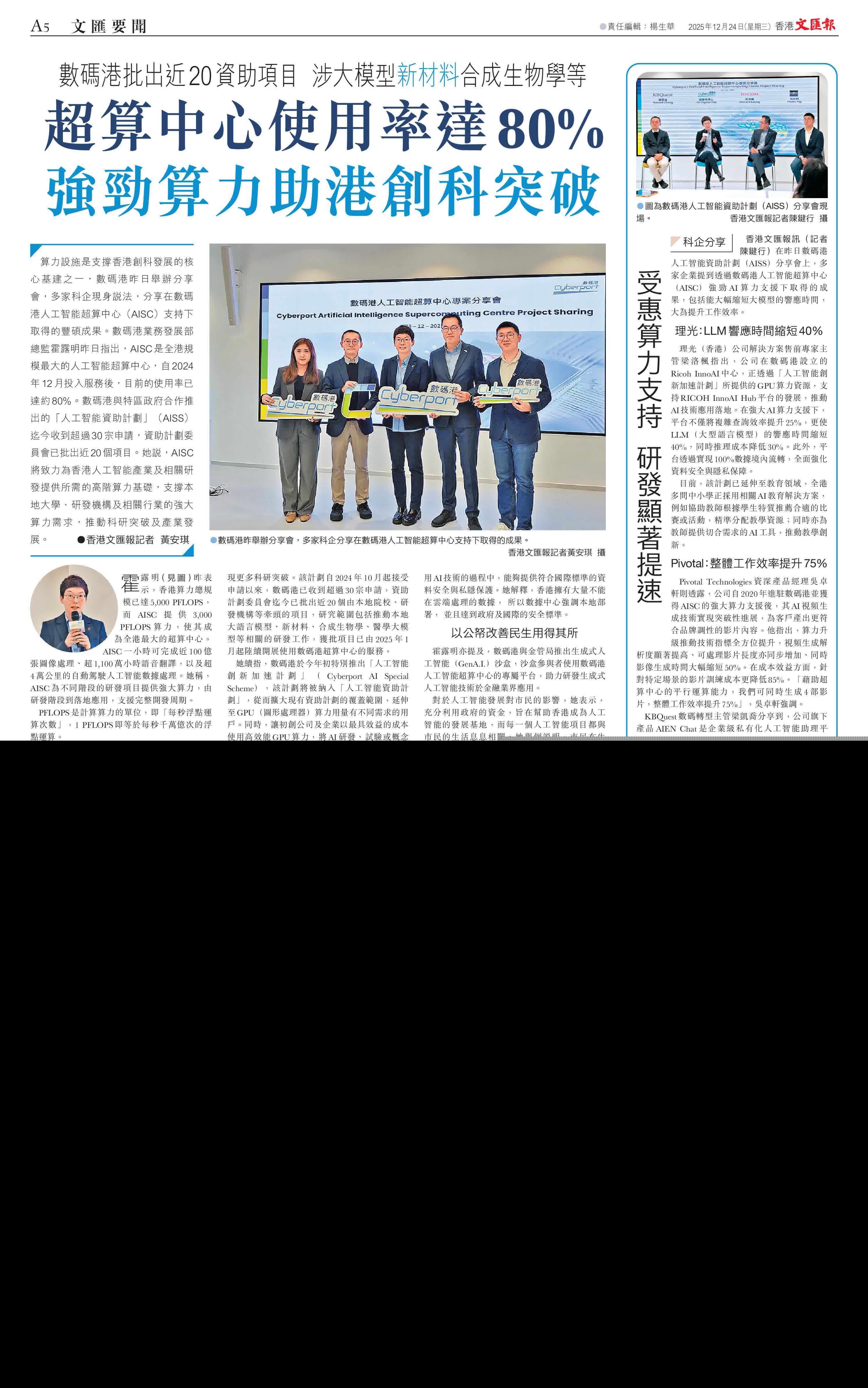 (香港文匯報記者 黃安琪)算力設施是支撐香港創科發展的核心基建之一,數碼港昨日舉辦分享會,多家科企現身說法,分享在數碼港人工智能超算中心(AISC)支持下取得的豐碩成果。數碼港業務發展部總監霍露明昨日指出,AISC是全港規模最大的人工智能超算中心,自2024年12月投入服務後,目前的使用率已達約80%。數碼港與特區政府合作推出的「人工智能資助計劃」(AISS)迄今收到超過30宗申請,資助計劃委員會已批出近20個項目。她說,AISC將致力為香港人工智能產業及相關研發提供所需的高階算力基礎,支撐本地大學、研發機構及相關行業的強大算力需求,推動科研突破及產業發展。