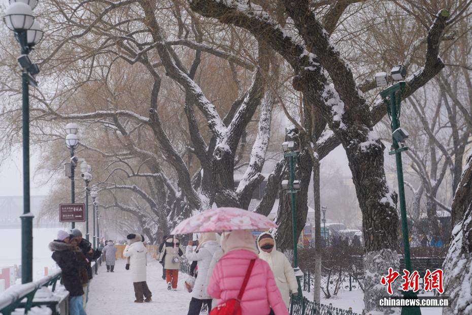 12月23日,黑龙江哈尔滨,游客雪中漫步。当日,哈尔滨迎来降雪天气,游客雪中赏景游玩,感受浪漫哈尔滨。中新社记者 赵宇航 摄