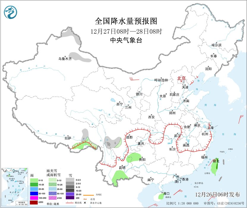 全国降水量预报图(12月26日08时-27日08时)